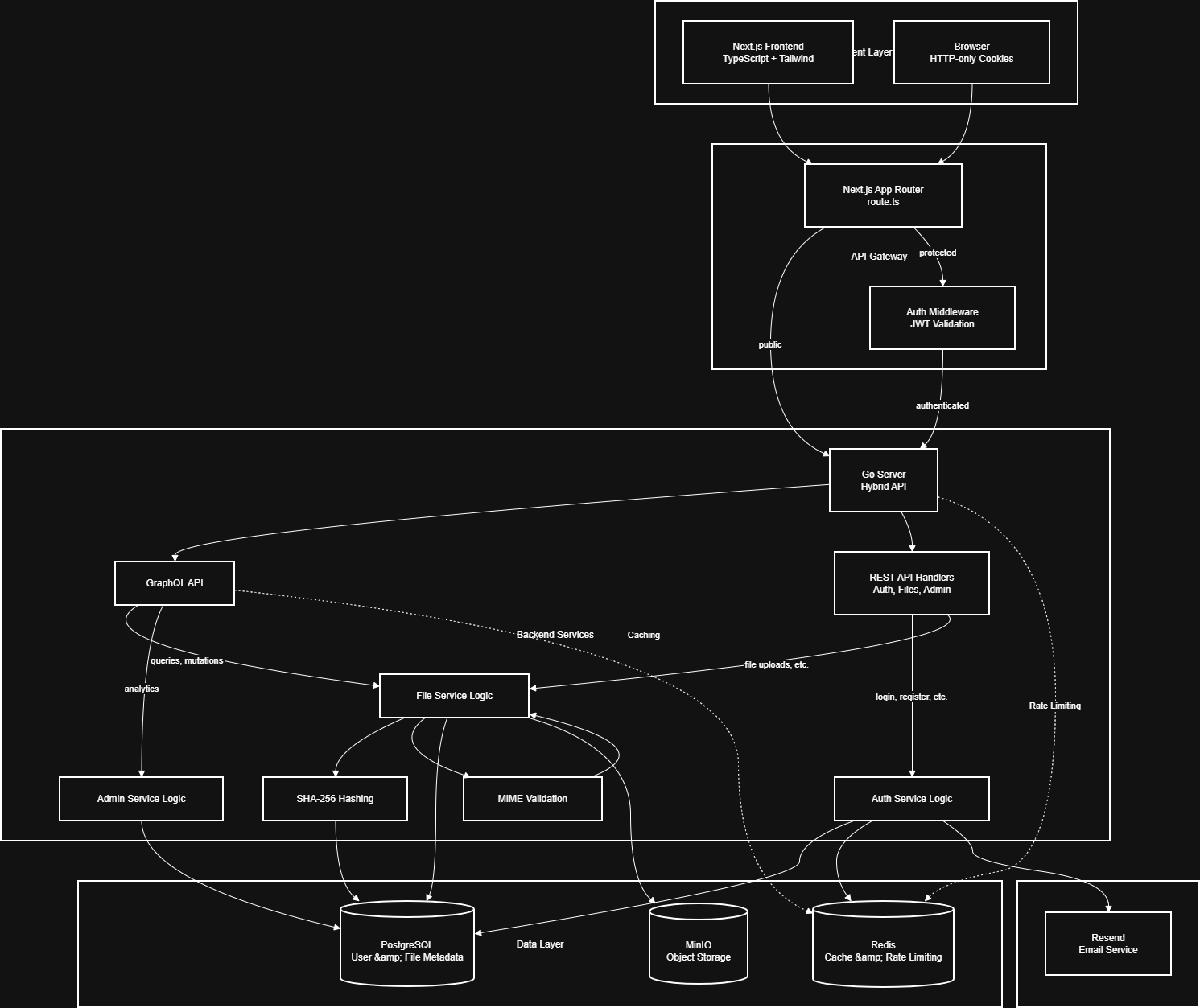 The original hybrid architecture: Next.js routing, Go backend services, and multi-tier data persistence built for the BalkanID capstone.